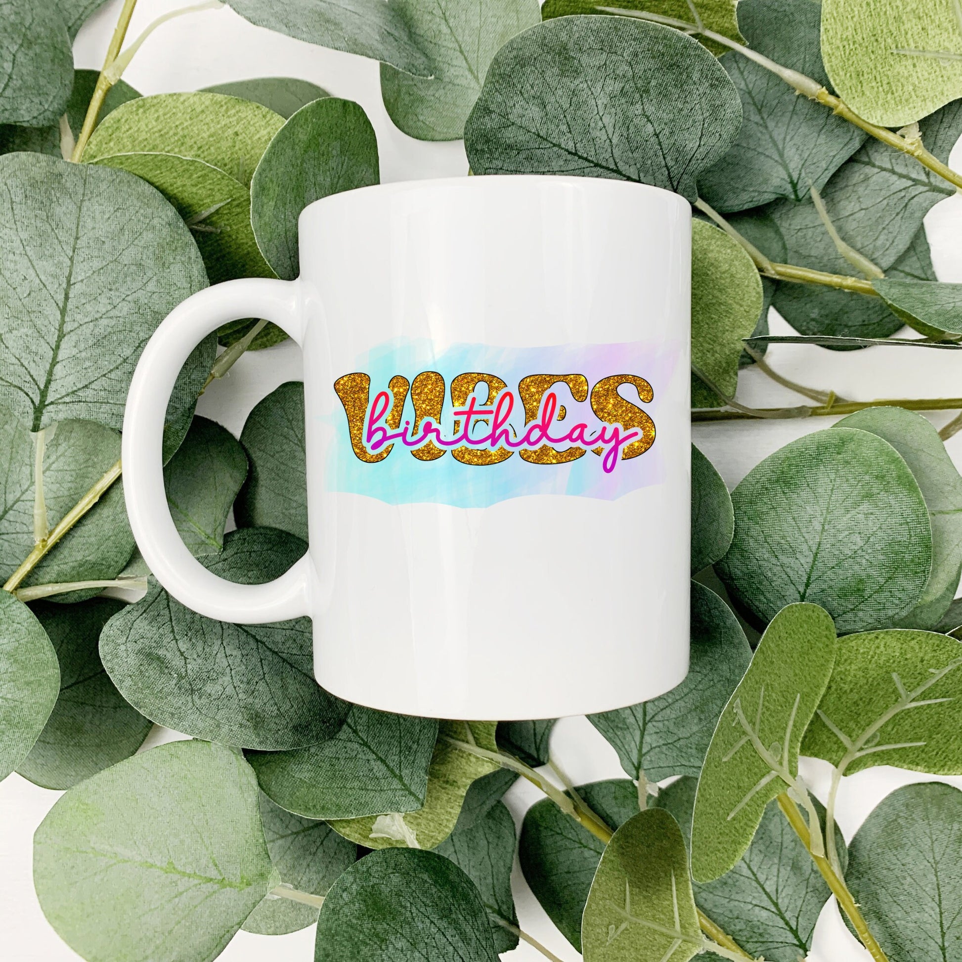 Birthday Vibes - Sublimation Coffee Cup - with sunglasses design- 15oz Cup - Two sided image