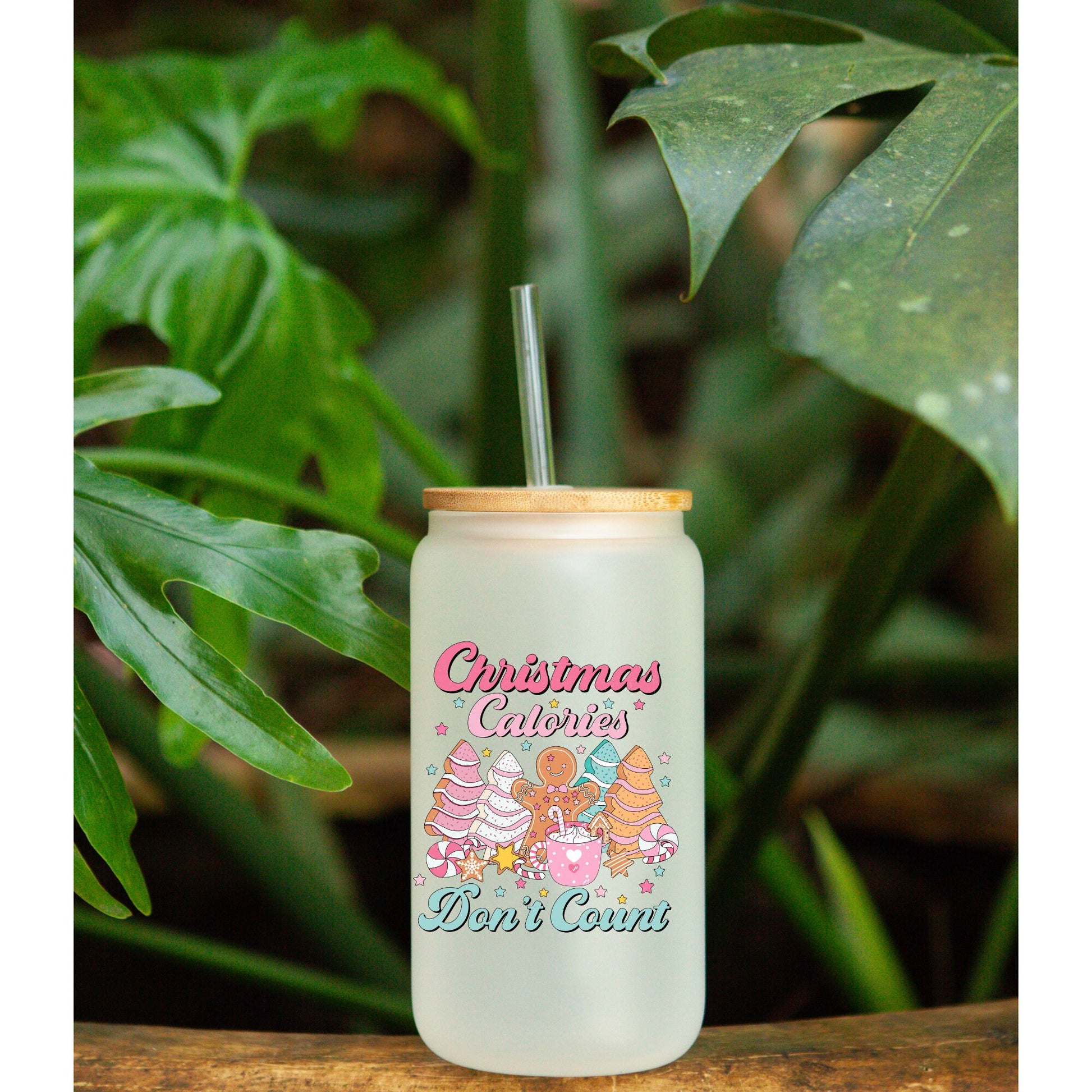 Christmas Calories Don't Count - 16oz Libby frosted Glass with bamboo Lid and Straw