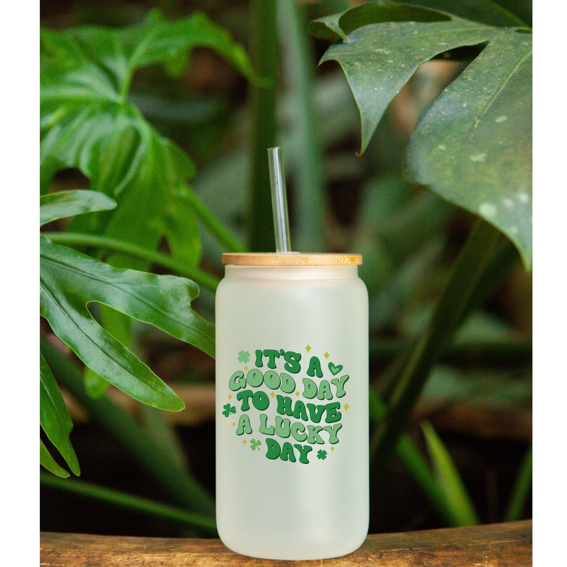 St. Patrick Day | Its A Good Day to Have A Lucky Day | 16oz Libby frosted Glass with bamboo Lid and Straw