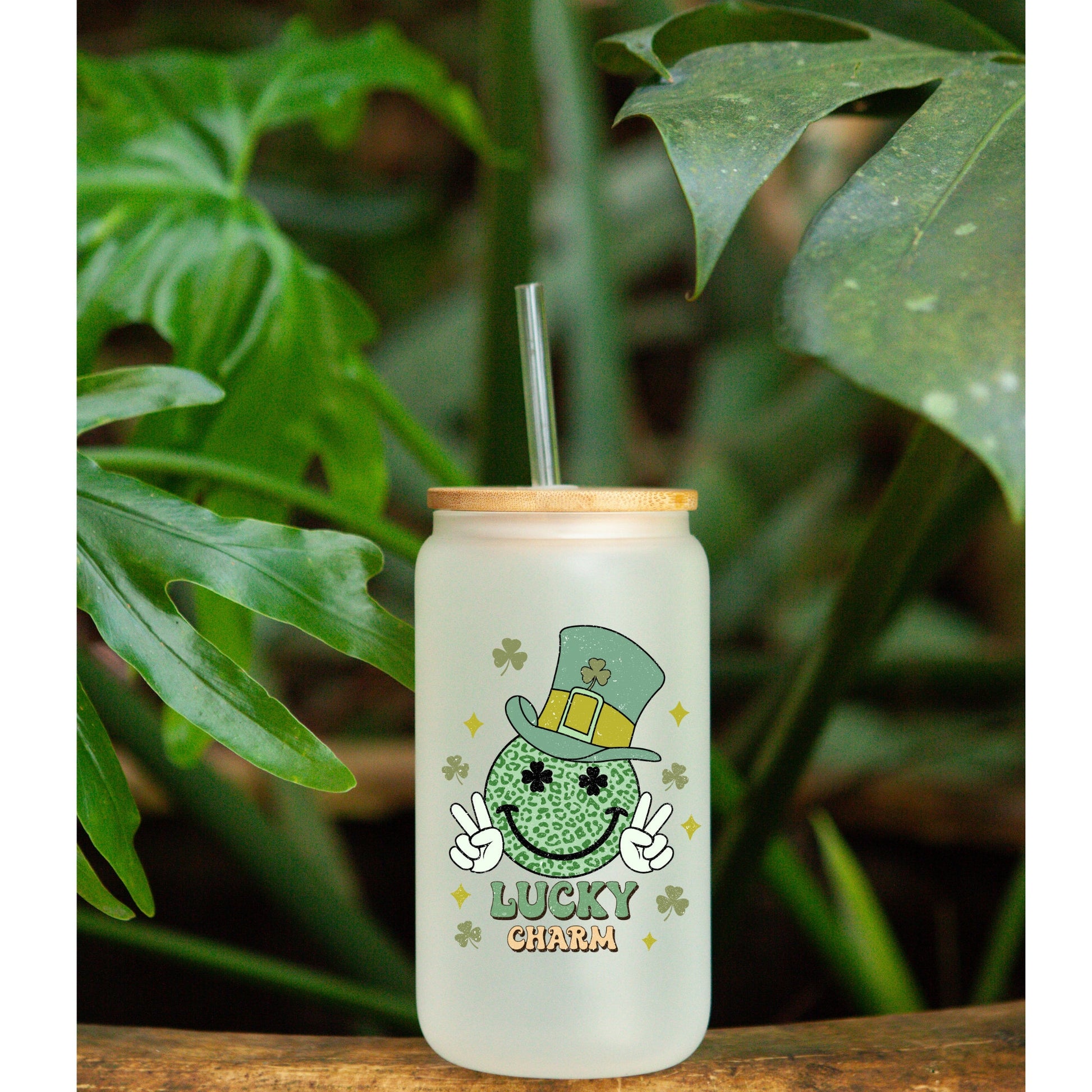 St. Patrick Day | Lucky Charm | 16oz Libby frosted Glass with bamboo Lid and Straw